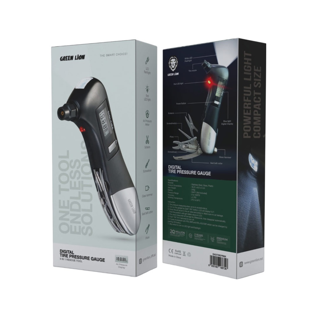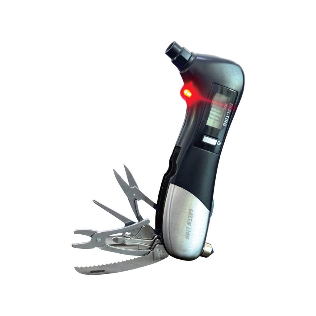 فشار سنج باد لاستیک به همراه ابزار گرین لاین green-lion-digital-tire-pressure-gauge-9-in-1-rescue-tool-gnditireprbk